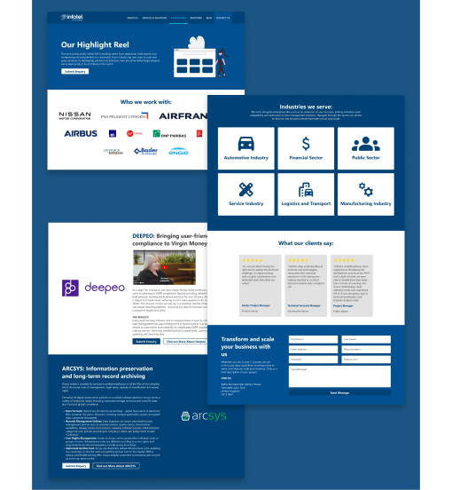 In early 2024 when the Infotel Marketing team was deciding the direction for website to go in for that year, it became apparent our company facing website lacked a ‘showcase’ page to demonstrate the best work of the company. This design was used as an initial test to see how possible changes for a new redesign of the company were received both internally and externally. All whilst displaying the best work of the company, whilst also using this page as a start of the user journey to view a particular project showcase case study.